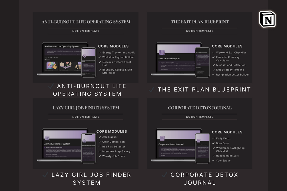 Four Notion systems that help you leave burnout behind, find aligned work, and rebuild your life on your terms.